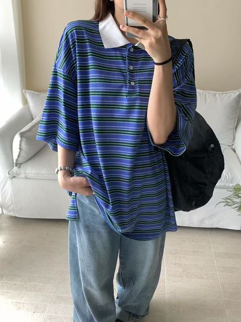 Juno低飽和撞色排扣毛衣 / 淺灰藍條紋 藏青黃條紋