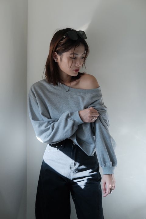 One-Side挖肩長袖上衣 / 可可咖 霧碳灰